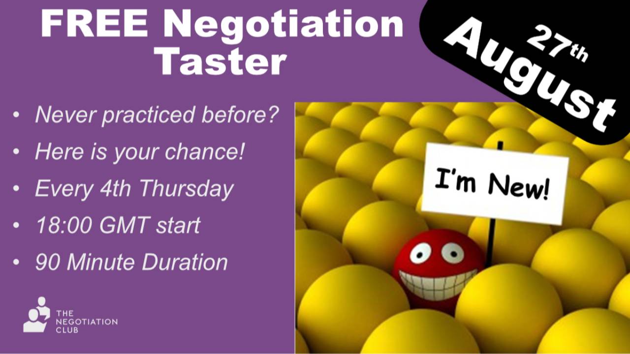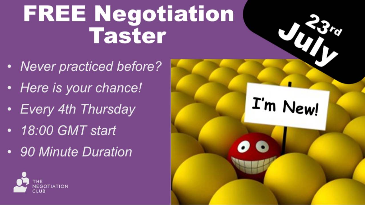 The 90 minute Taster Session is a free, hands-on negotiation workshop designed for all experience levels. You’ll experience practical negotiation exercises using Negotiation Cards, the core tool we use to enhance skills through practice. Supported by The Negotiation Club members, you’ll have the opportunity to ask questions, get real-time insights, and see how consistent practice can improve your confidence and ability. It’s a perfect introduction to the value of structured negotiation practice.